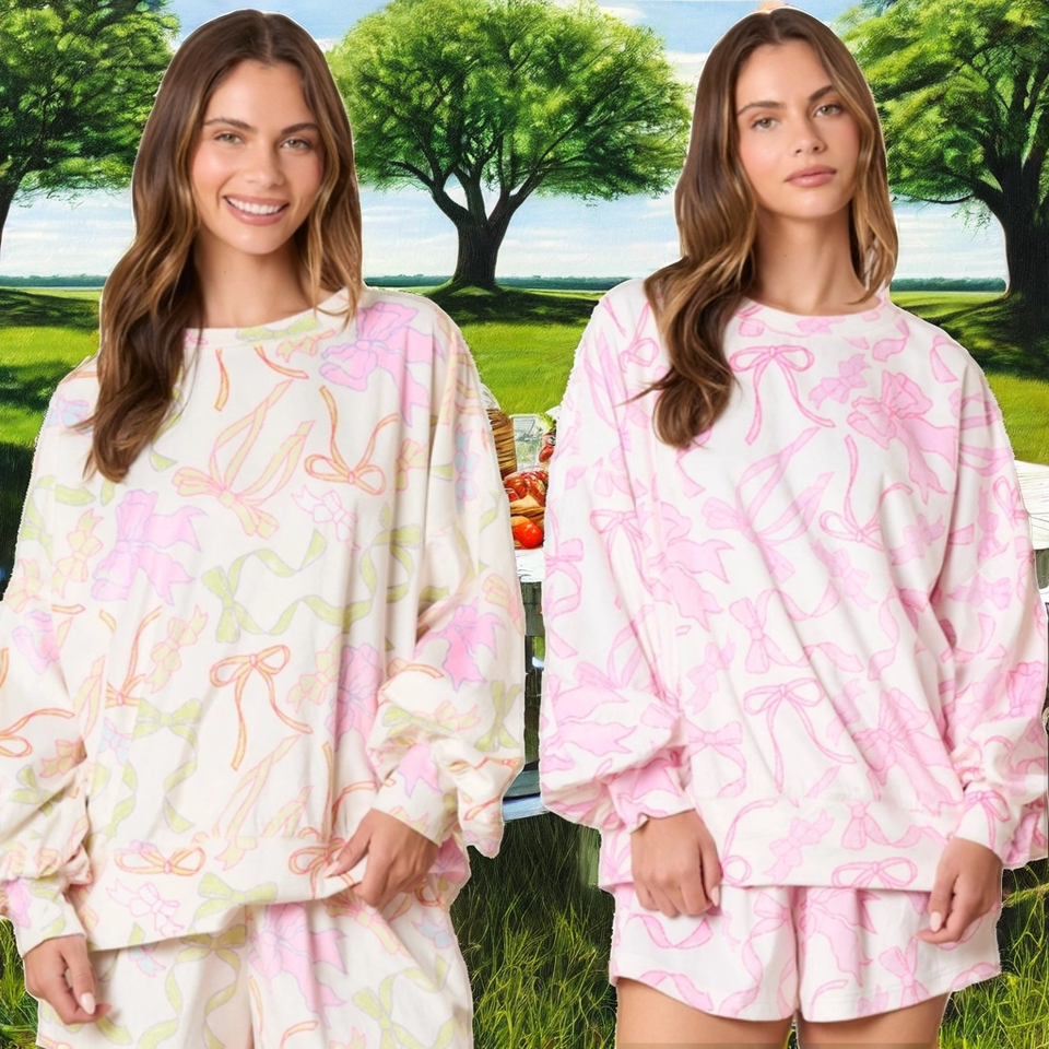 Autumn Casual Women's Two-Piece Set Woven Polyester Long Sleeve Tops Bow Ribbon Loose Shorts Breathable Eco-Friendly