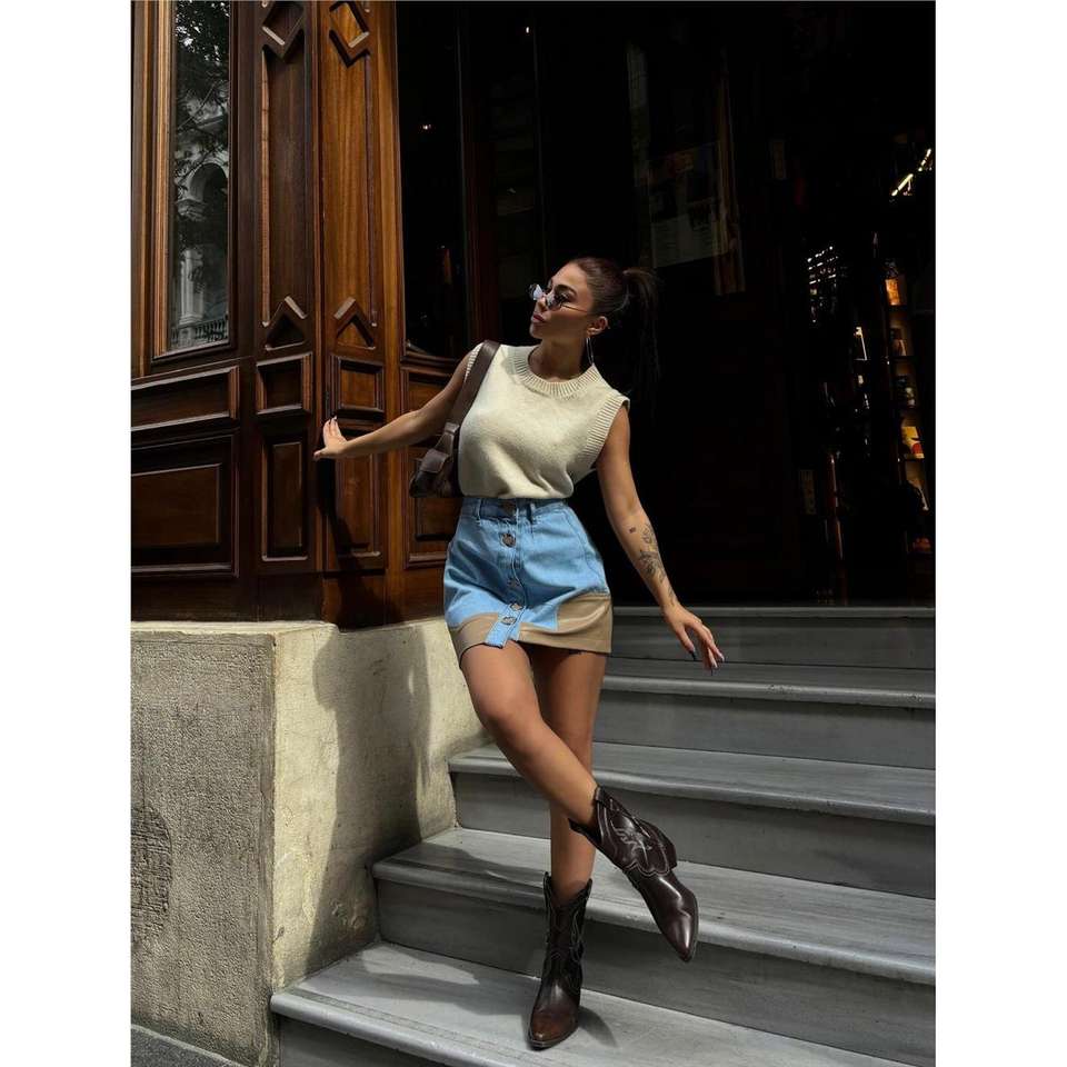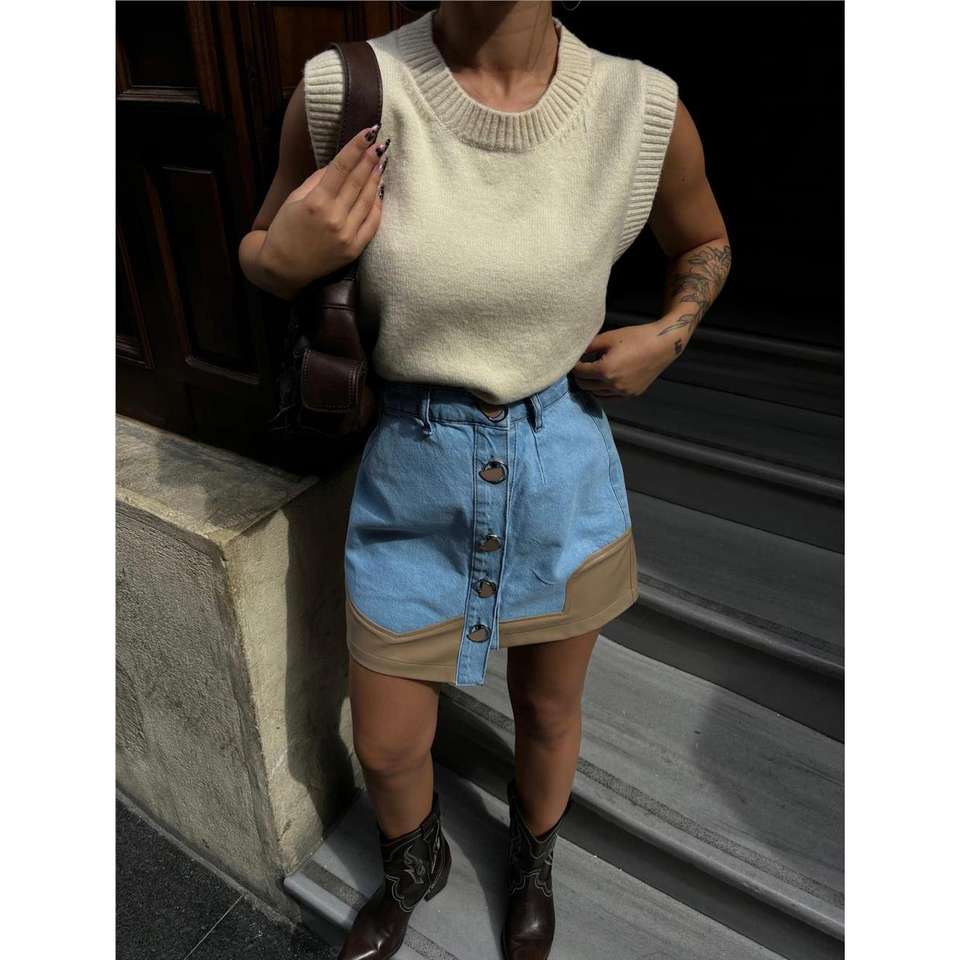 Autumn Cute Short Denim Skirt Distressed Washed Leather Trim Button Closure Y2K Vintage Style-Beige Midi Maxi Slit Waist