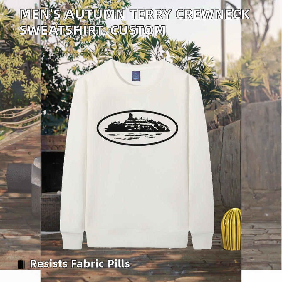 Autumn Fashion Men's 320g Knitted Terry Crewneck Sweatshirt Solid Loose Fit Custom Logo Anti-Pilling Digital Printing Cotton