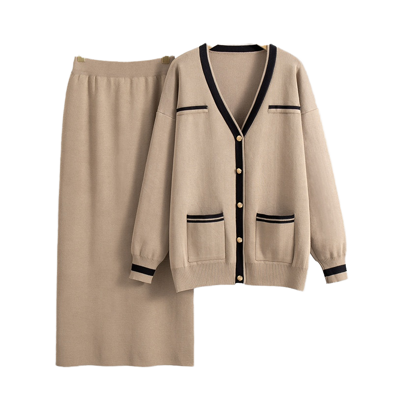 Autumn Leisure Knitting Two Piece Set Fashionable Regular V-neck Sweater Skirt Casual Breathable Solid Pattern for Women