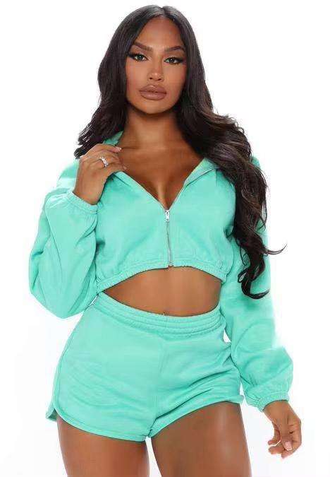 Autumn New Casual 2 Pieces Set for Woman Solid Zipper Long Sleeve Hooded Crop Top and Shorts Matching Female Streetwear