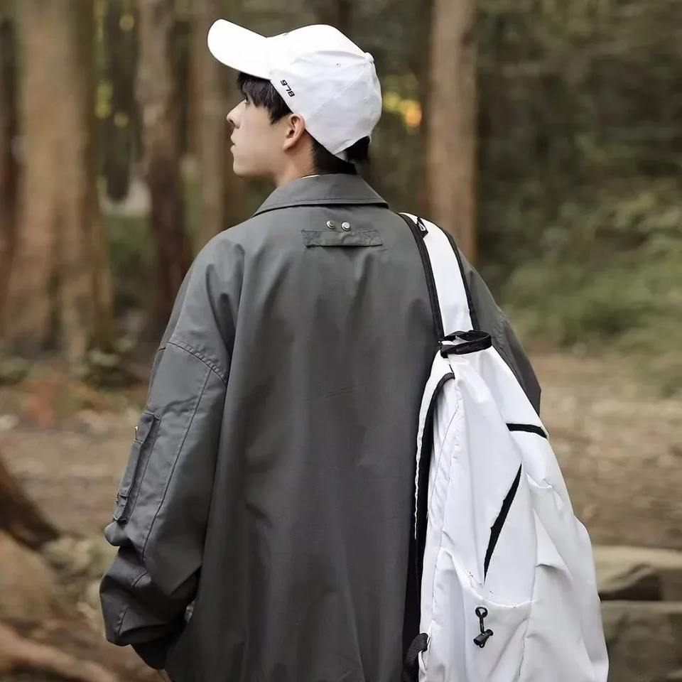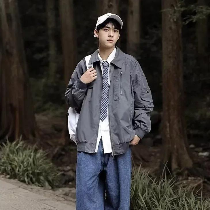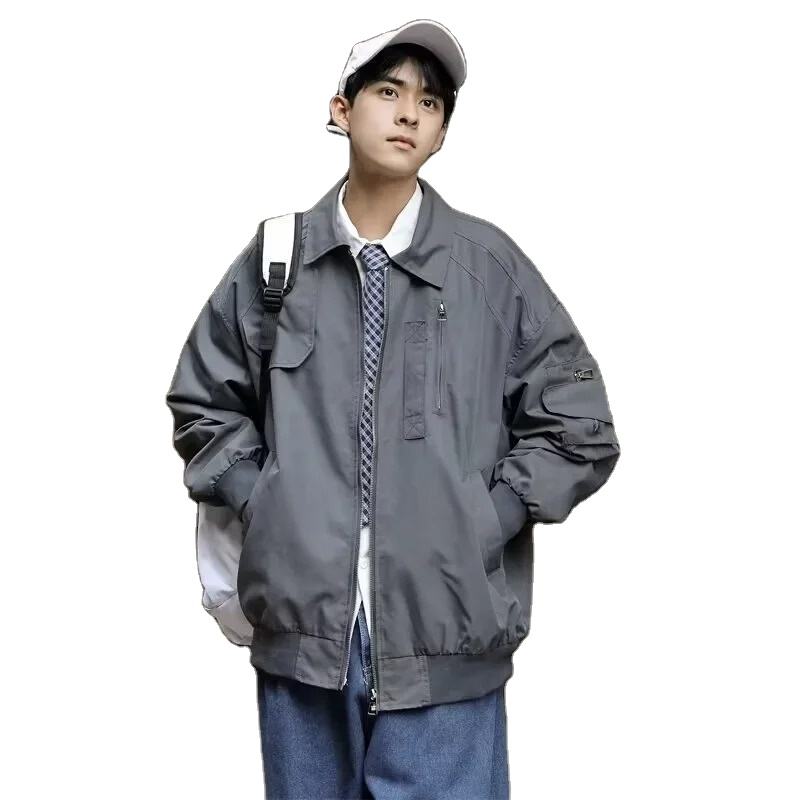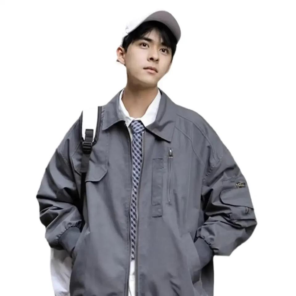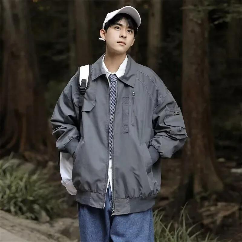 Autumn New Men's Trendy Faux Leather Jacket with Thin Lapel Youth PU Leather Casual Loose Fit Coat Canvas Fabric