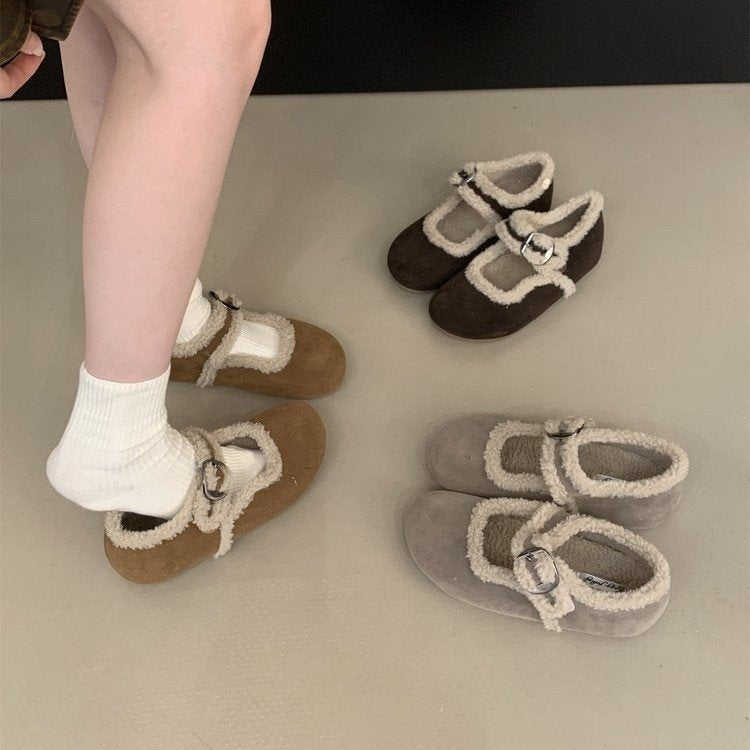Autumn Single Mary Jane Low-Top Shoes Round Toe Shallow Mouth Artificial Short Plush Suede Rubber Chunky Low Heel (Less 3cm)