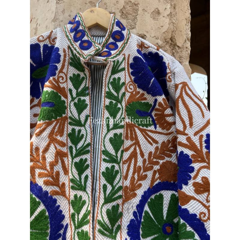 Autumn Unisex Short Coat Uzbek Floral Embroidery 100% Cotton Jute Suzani Fabric Party Wear Hippie Style Jacket Knitted Processed