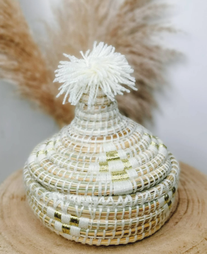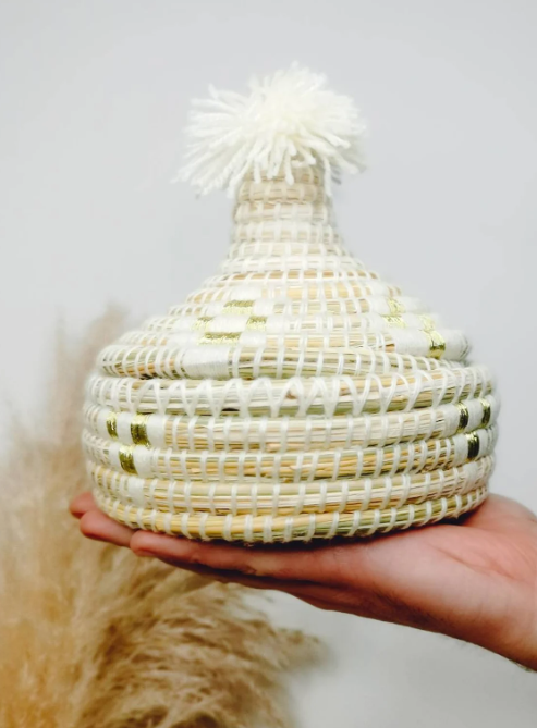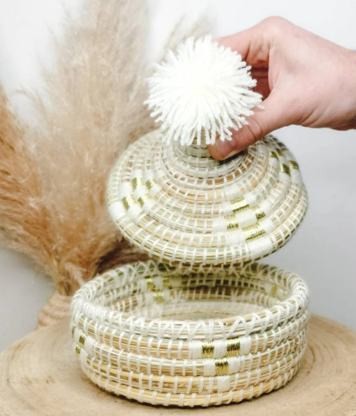 Mode:Handcrafted Moroccan Round Lidded Basket With A Wool Pompom