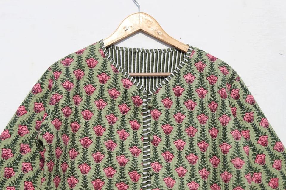 Autumn/Winter Cotton Quilted Jacket for Women Block Printed Boho Style Handmade Long Length Breathable Woven Clothing