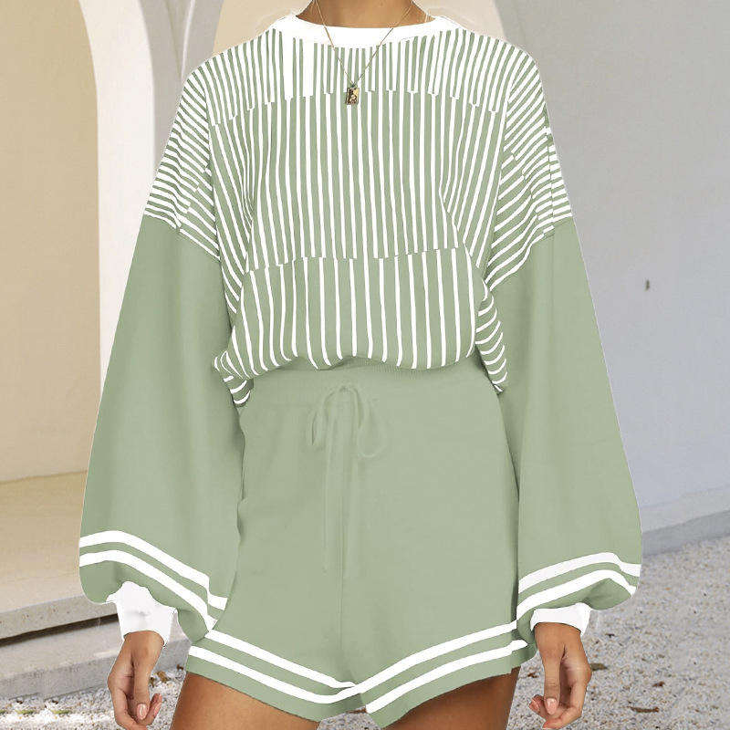Autumn/Winter New Sweater Set Women Color Blocked Striped Knitted Shirt Long Sleeve Shorts Two Piece Set OEM