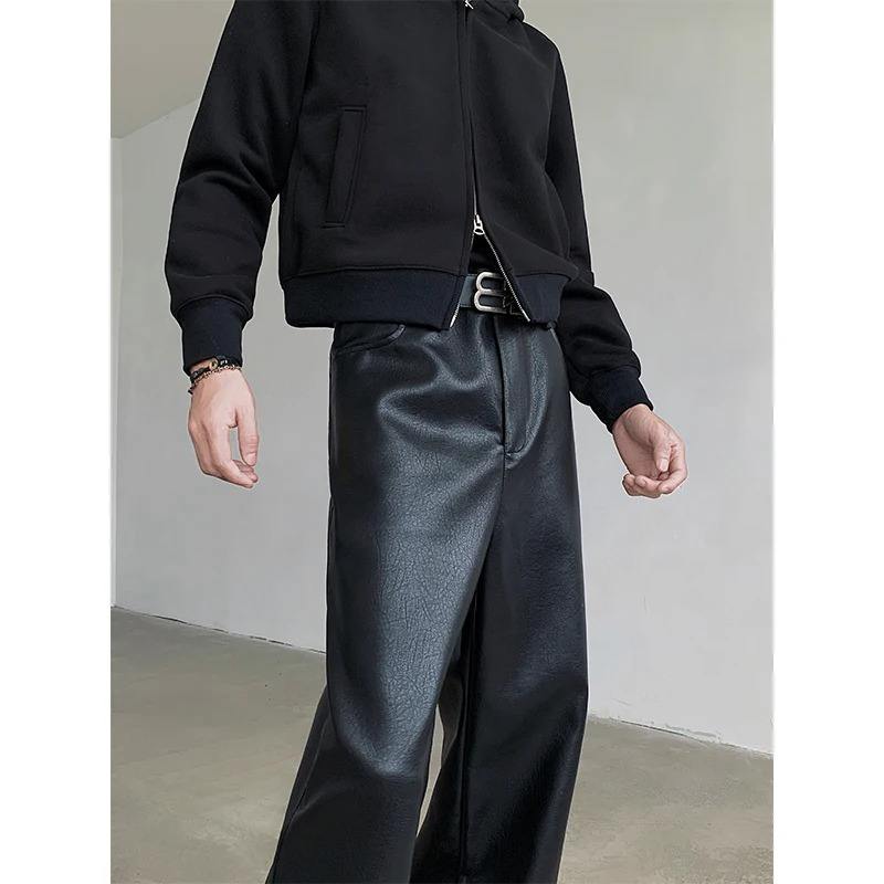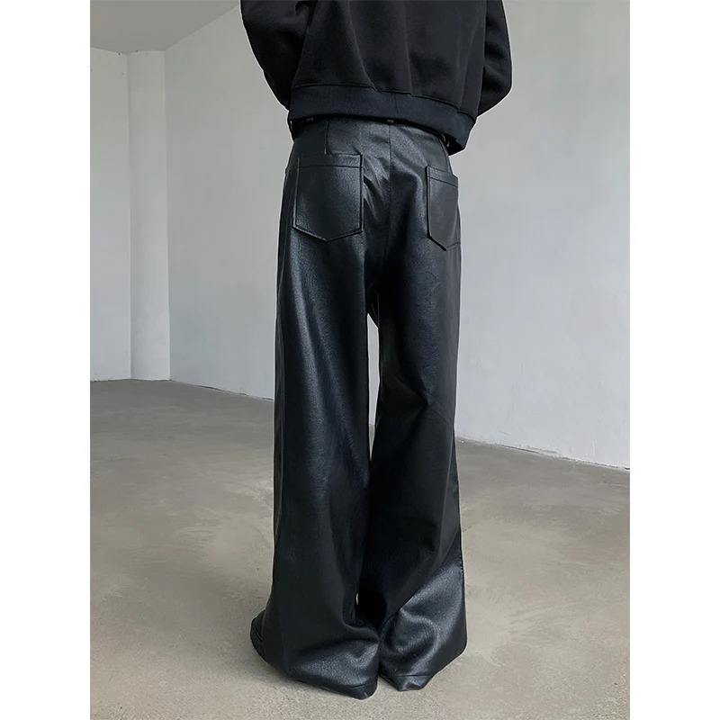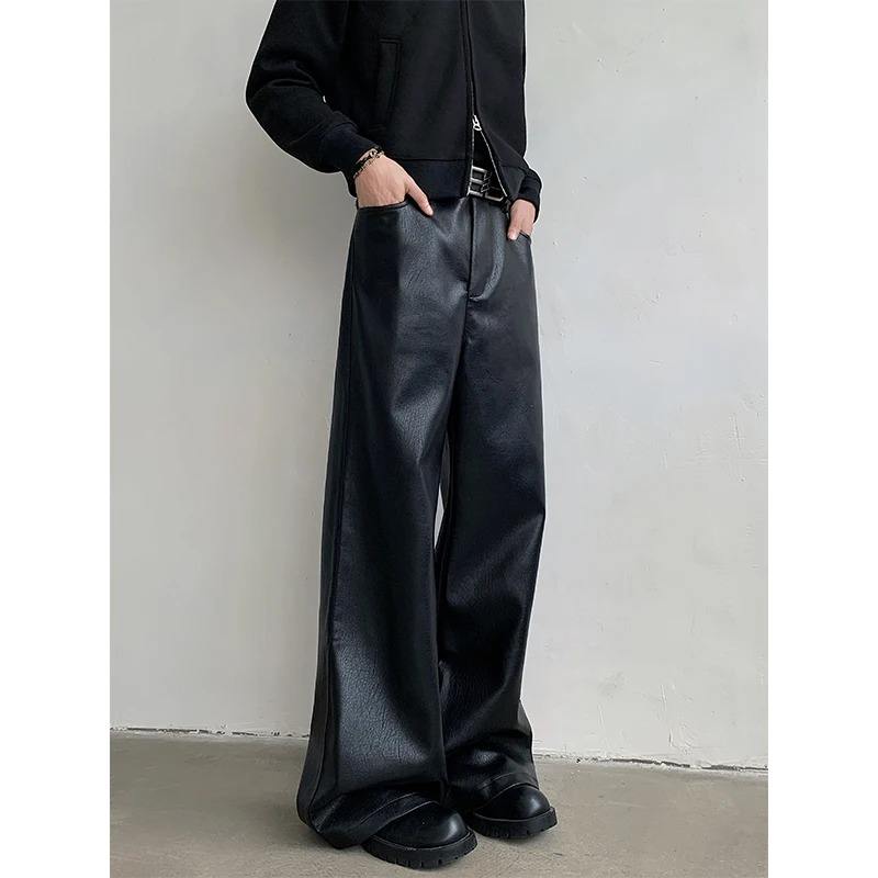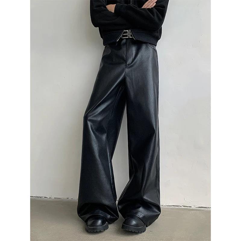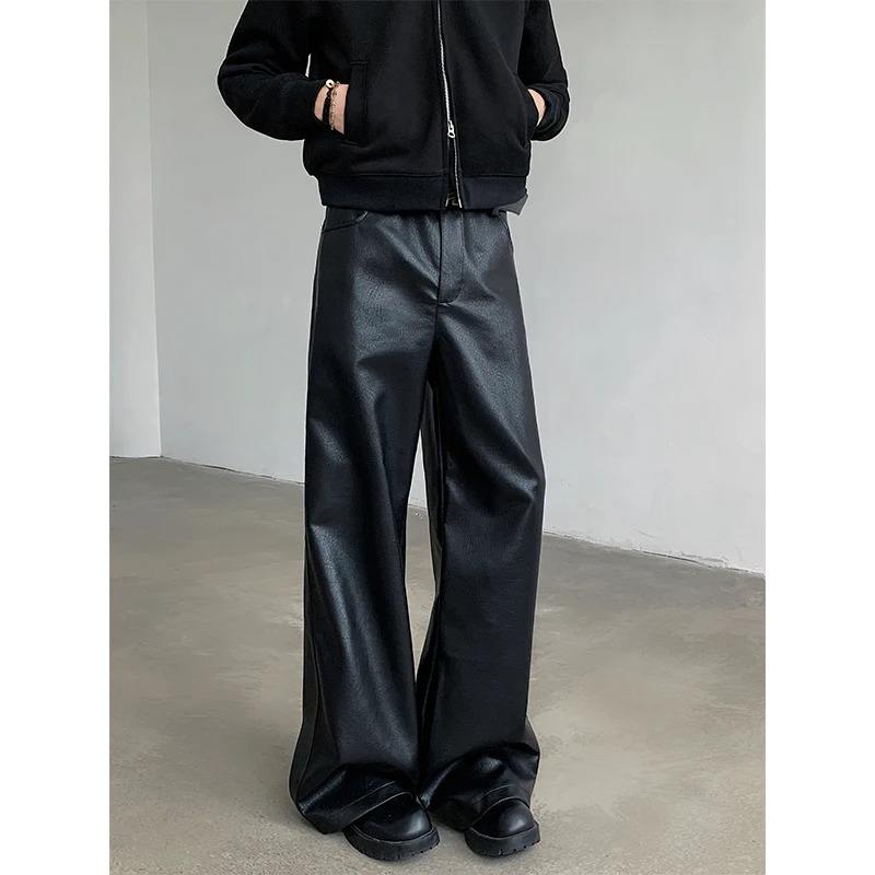 Autumn Winter Punk Men's PU Leather Pants Fashion Black Hipcool Men Zipper Wide-leg Mopping Trousers All-match Windproof