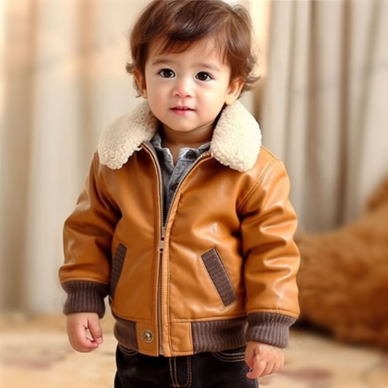 Autumn Winter Thick Fleece Lined Kids Jacket Hooded fur with Leather Sleeves Breathable and Warm for Toddler Boys & Girls