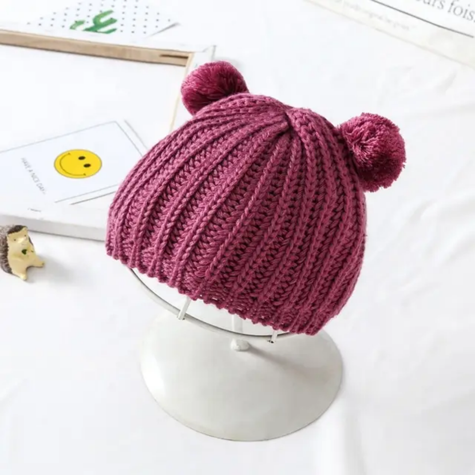 Autumn Winter Warm Striped Beanie for Baby Kids High Quality Custom Knitted Hat with Cute Plain Pom Pom Solid Fashion Image