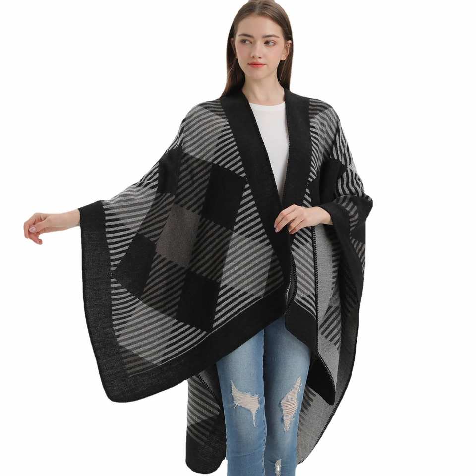 Autumn/Winter Women's Cashmere Imitation Leaf Argyle Geometry Pattern Square Split Retro Ethnic Windproof Shawl Cape Outerwear