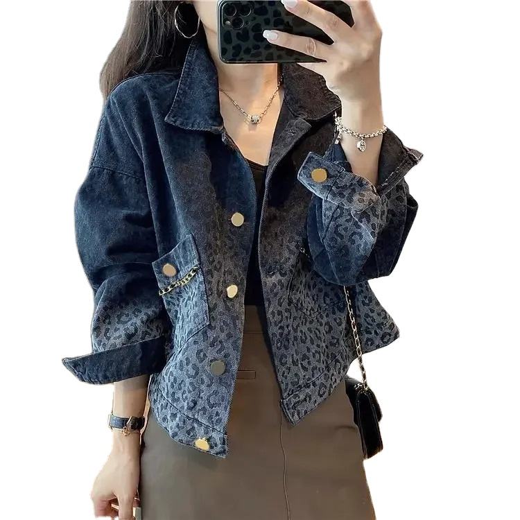 Women's Autumn Winter Denim Jacket Single Breasted Casual Collar Top Printed Grinding Edge Broken Hole Hollow Long Sleeve New