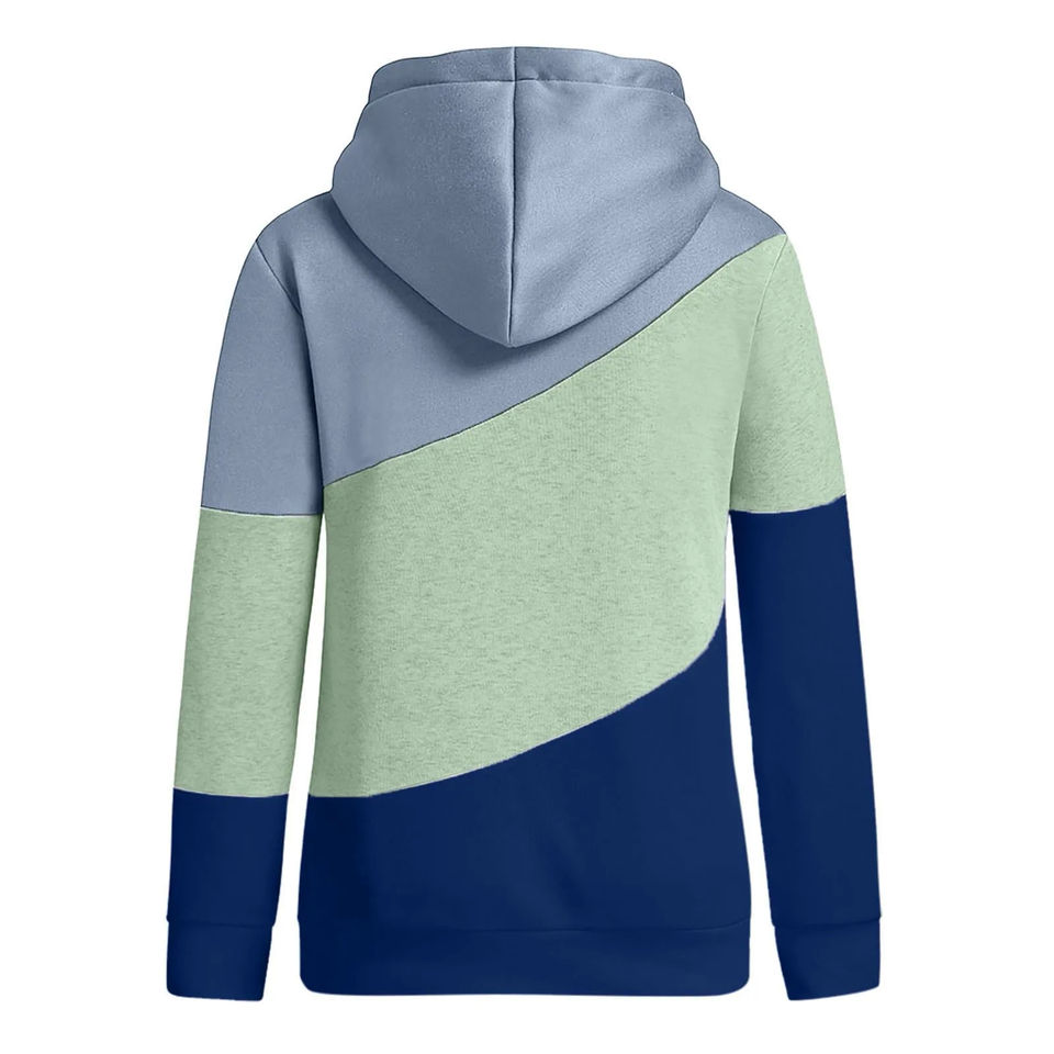 Autumn Women's Black Sweatshirt with Three-Color Stitching Drawstring Hood Casual Fashion Cap Collar Long Sleeves-Breathable Top