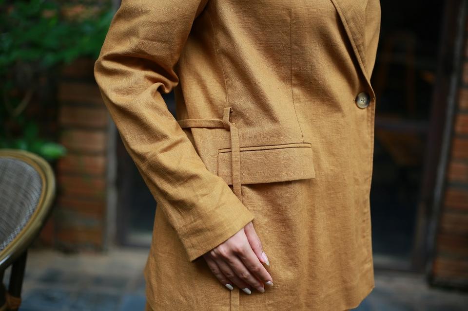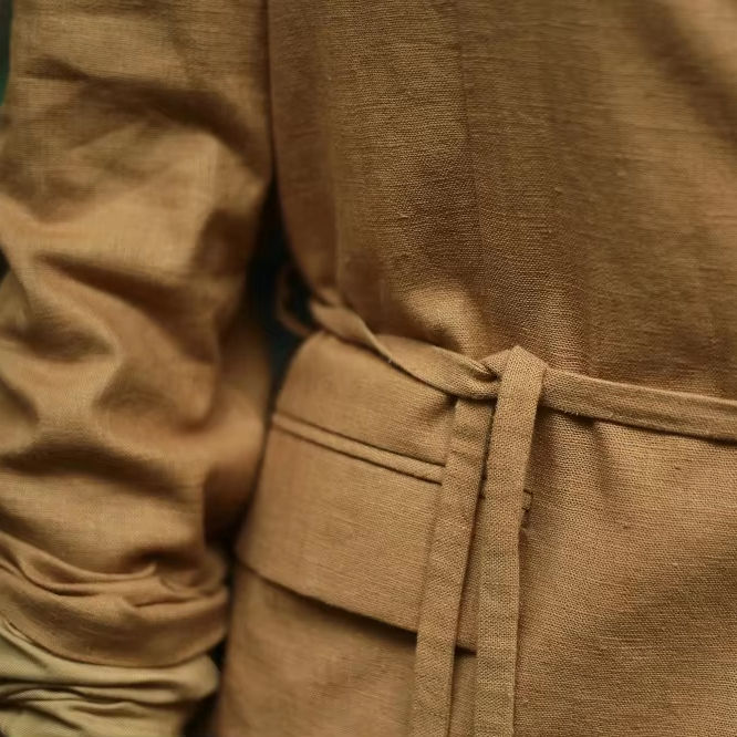 Autumn Women's Thin Ramie Slouch Tie Jackets Plaid Pattern Woven Cotton Front Flap Button Decoration Side Pockets for Winter