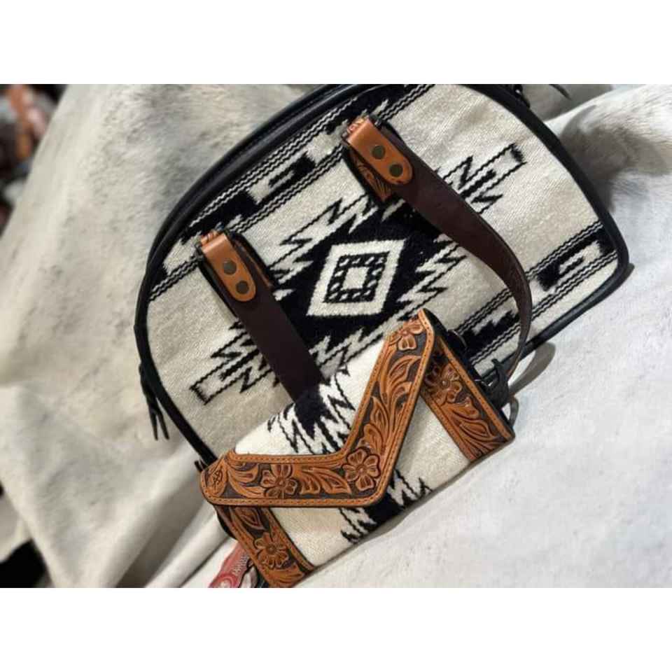 Azetec Best Price Vintage Western Leather Handbag Tooled Curving Saddle Blanket PVC Lining with Geometric Pattern Zipper Closure