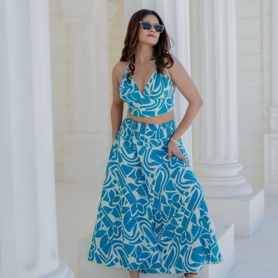 Azure Floral Bell Sleeve Two Piece Outfit Wrap Crop Top and Long Skirt Tropical Bohemian Summer Resort Matching Co ord Set