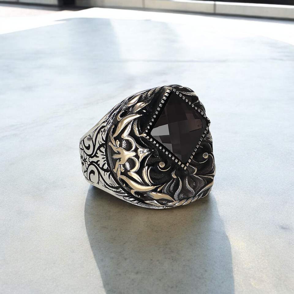 Azuris High Quality Ottoman Style 925 Sterling Silver Men's Ring with Natural Black Stone Turkish Made VALKH1703