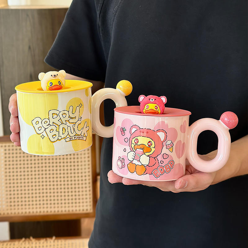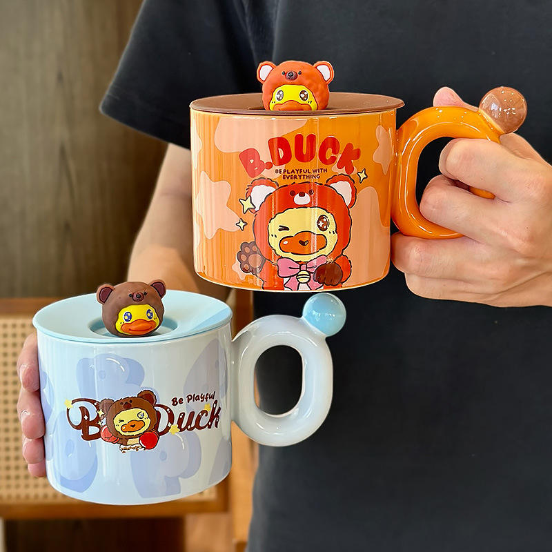 B.Duck Ceramic Mug With Lid And Handle Cartoon Design For Travel Single Cup Orange Blue Pink Yellow