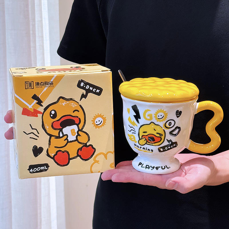 B Duck Ceramic Mug With Lid And Spoon 400Ml Cartoon Design For Coffee Water Breakfast Gift For Girls