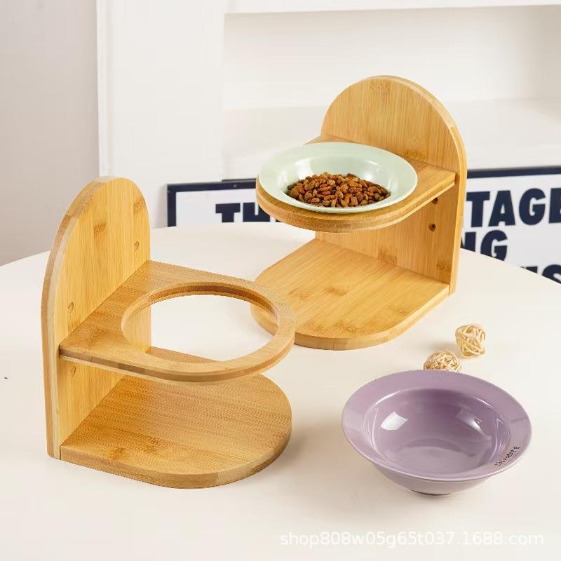 B.HAPPY PET Bamboo Cat Bowl Stand Elevated Feeder Rounded Shape Solid Wood Pet Feeder For Cats