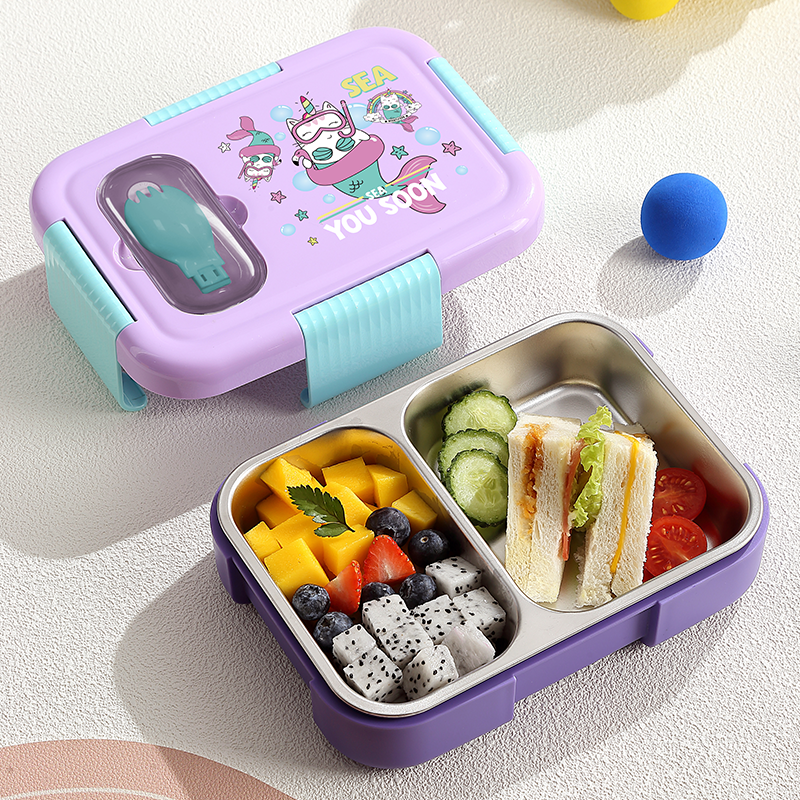 B171 Plastic Bento Lunch Box Kids Foldable Spoon PU Insulated Layer Cute Cartoon Design Leakproof Durable Heatable