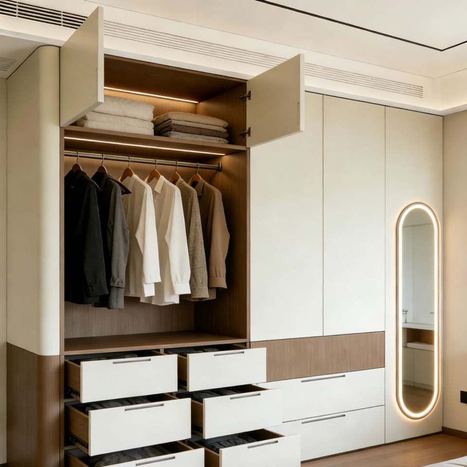 BALOM Minimalist Modern Storage Wardrobe Two-Tone Panel & Flip-Top Compartment Adjustable Drawers Bedroom Closet