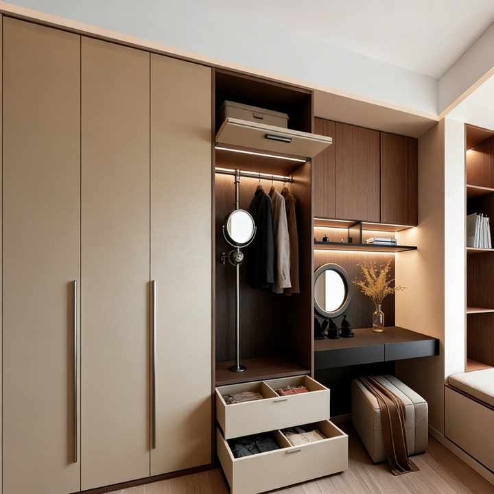 BALOM Walk-in Closet with Neutral & Wood Tones Integrated Lighting & Built-in Vanity Custom Wardrobe Setup