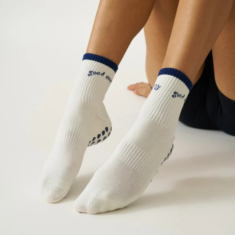 BCSI Custom Logo Good Energy Navy Blue Letter Pattern Breathable Anti-Slip Cotton Crew Socks Women's Yoga Pilates Gym Studios
