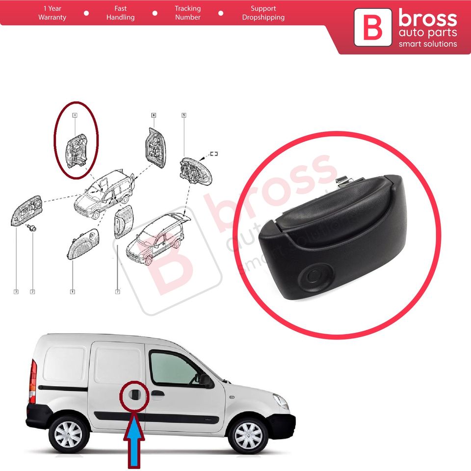 BDP1558-2 Right Side Sliding Door Exterior Opener Handle Black for Kangoo KC Express FC Kubistar MK1 X76 8200107372