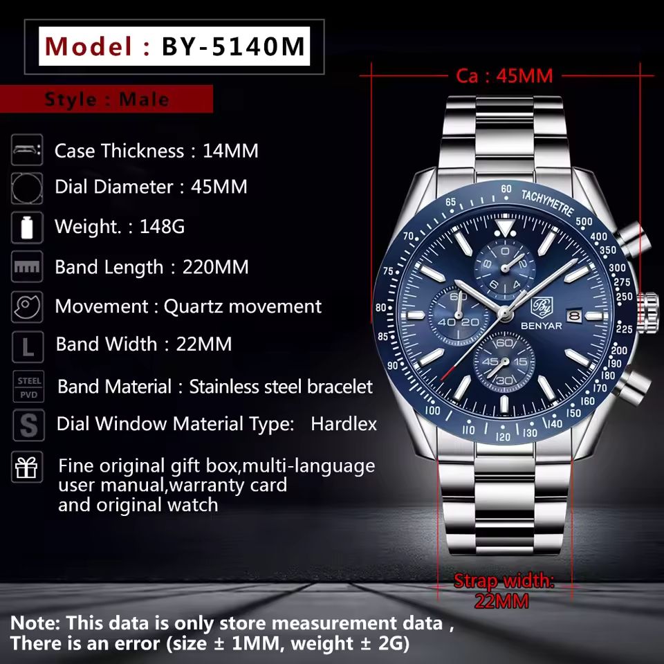 BENYAR Top Brand Men's Luxury Quartz Watch Full Steel Business Casual Waterproof Sports Watches Stainless Steel Men's Relogio