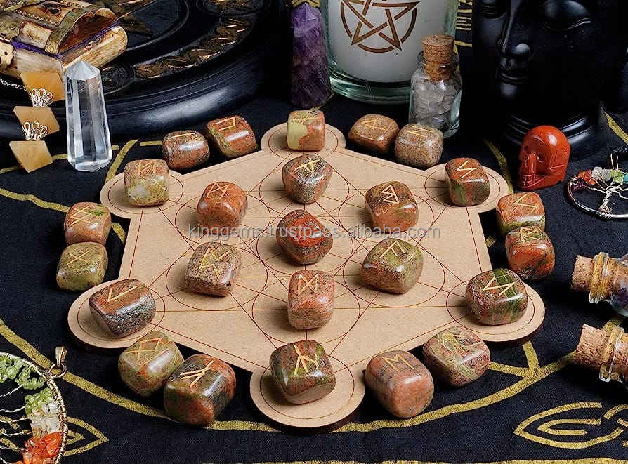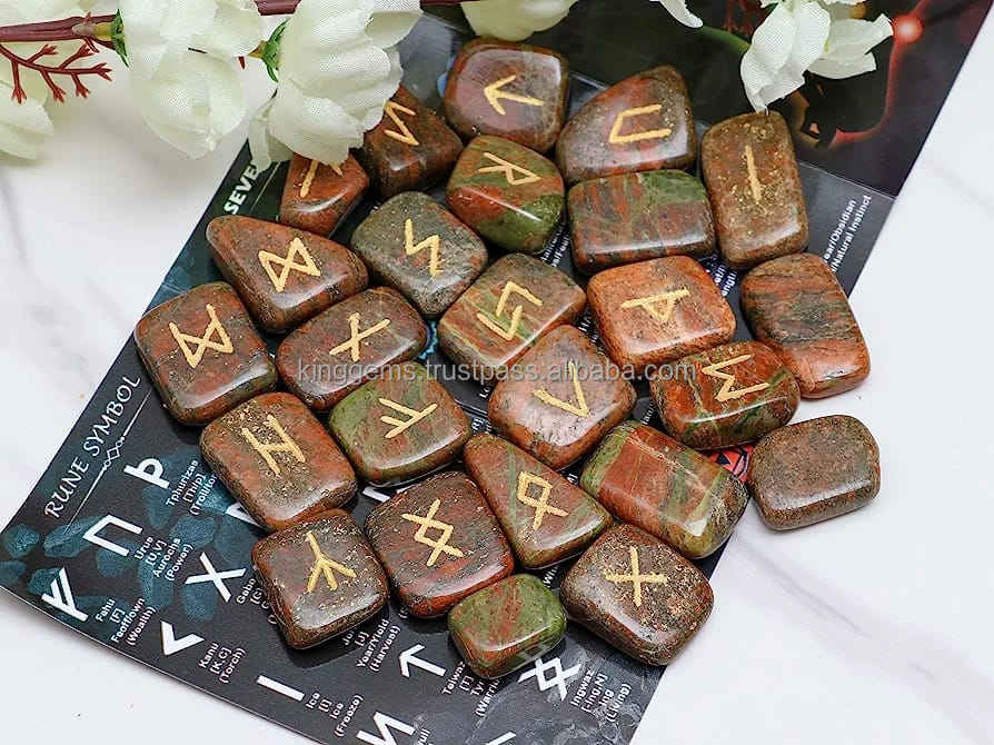 Best 25-Piece Unakite Tumble Runes Set Feng Shui Engraved Healing Crystals Semi-Precious Stone Crafts for Home Decor Carved