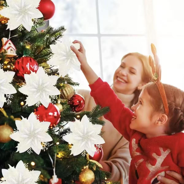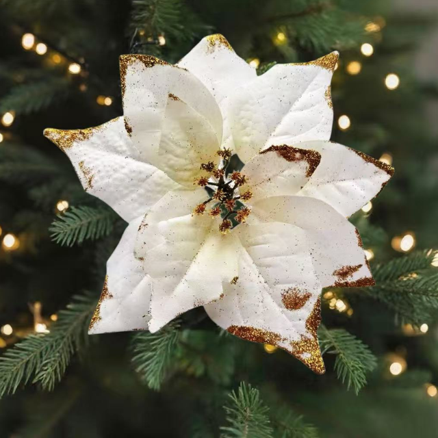 BINLU White Glitter Poinsettia Lovely Artificial Christmas Flower with Stick for Tree Ornaments