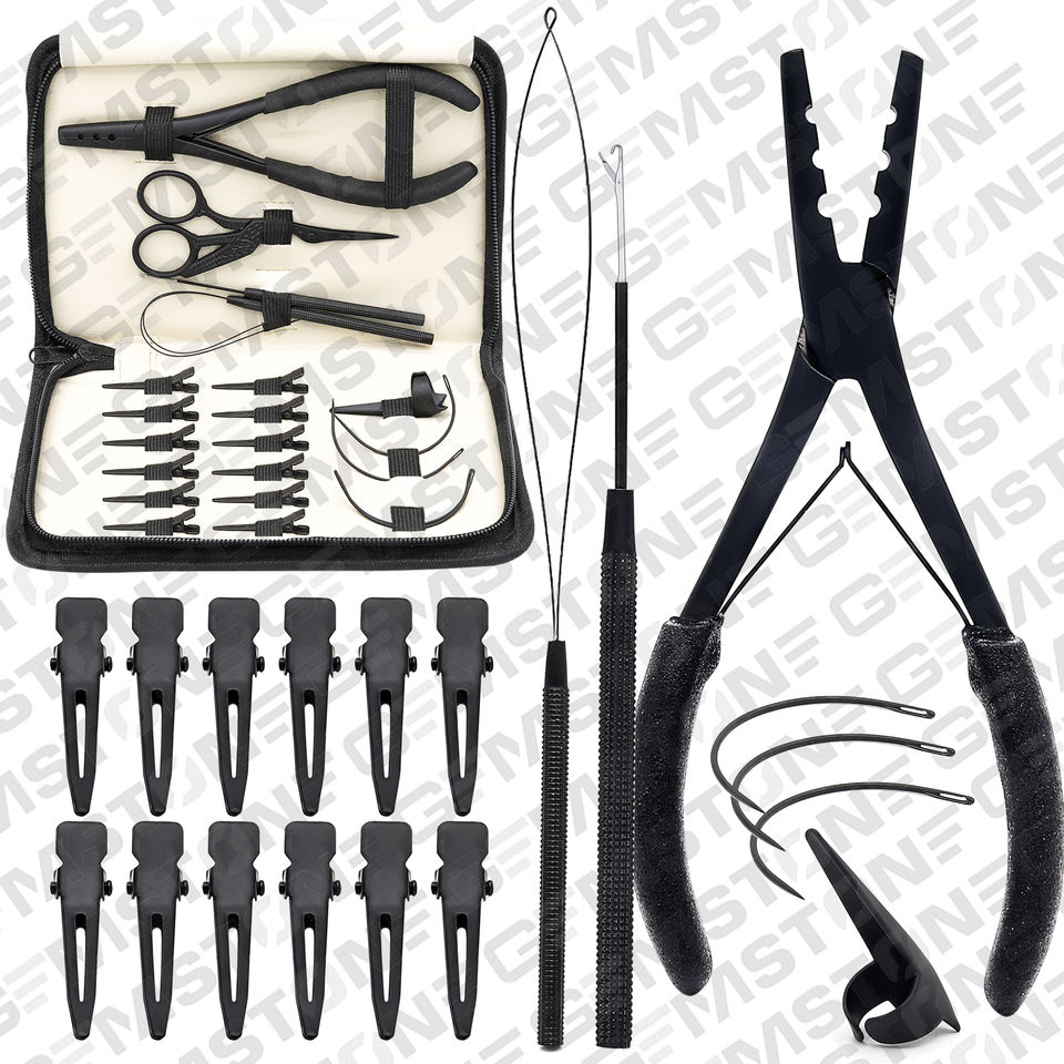 Black Stainless Steel Hair Extension Tool Kit Section Clipping Loop Hook Ring Scissor Needles Parting Tools