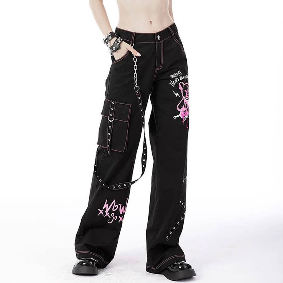 BLACK HOT LOVE PINK THREADING GOTHIC PUNK METAL STUDDED BAGGY TROUSERS MADE FROM 100% COTTON