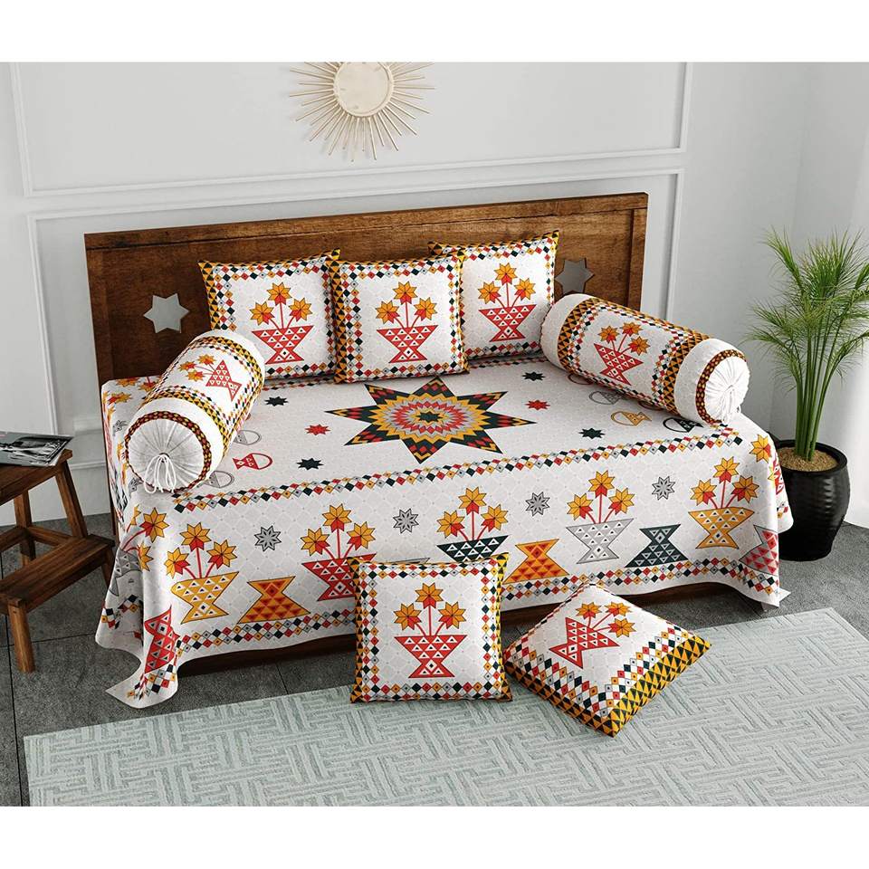 1 Bedsheet,2 Bolster Covers,5 Cushion Covers