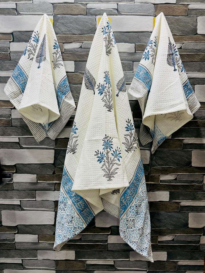 BLOCKS of INDIA Cotton Hand Block Printed Soft Waffle Fabric Bath Towel Set 1 Bath Towel and 4 Hand Towel (Color 5)