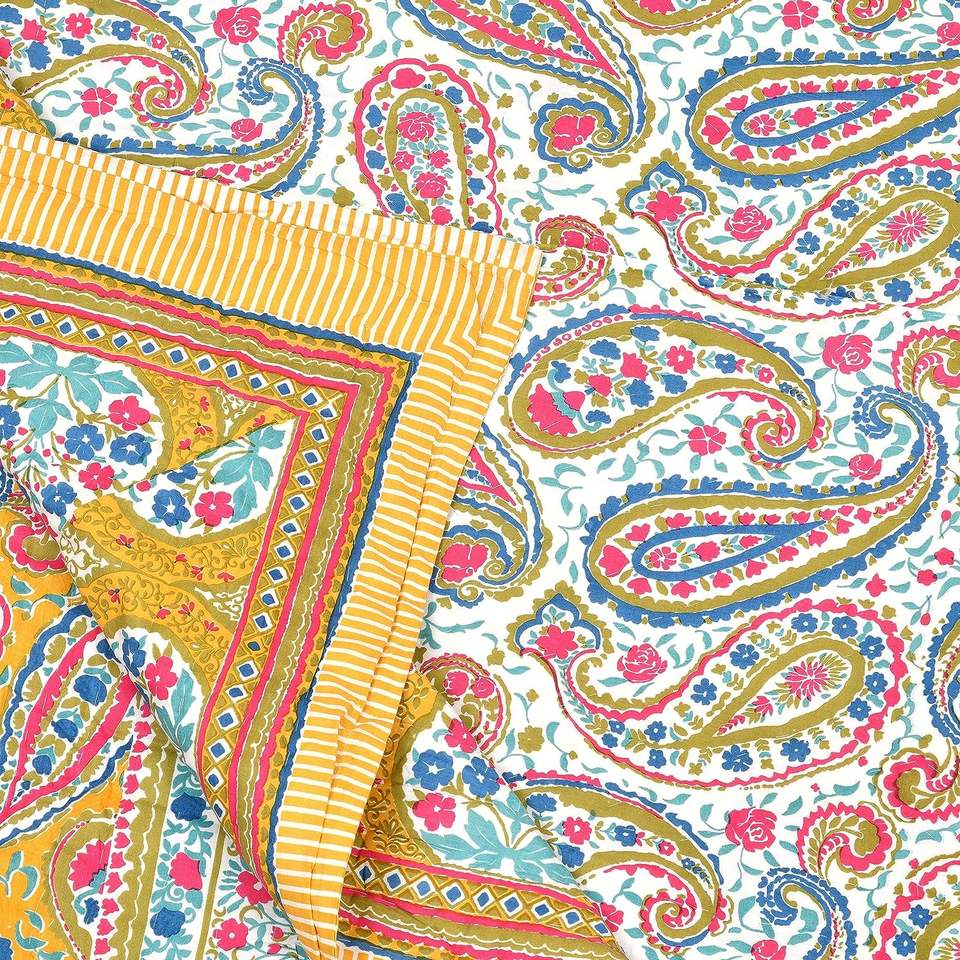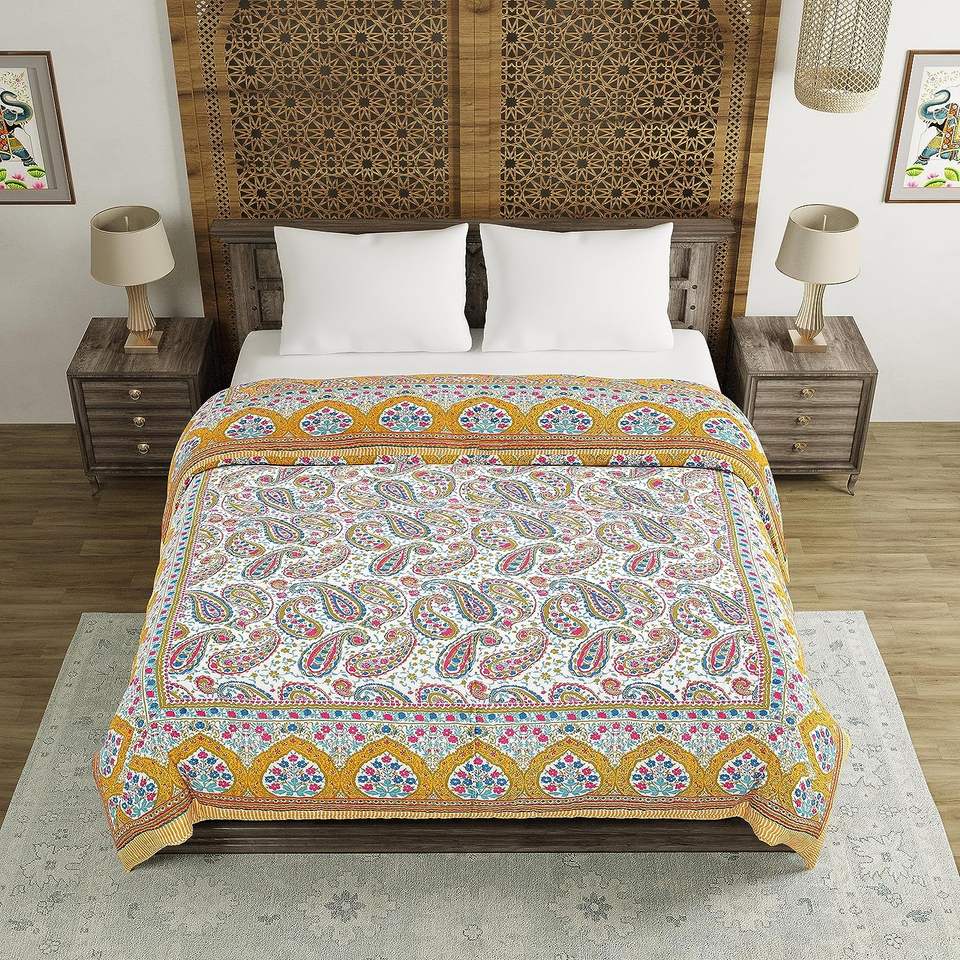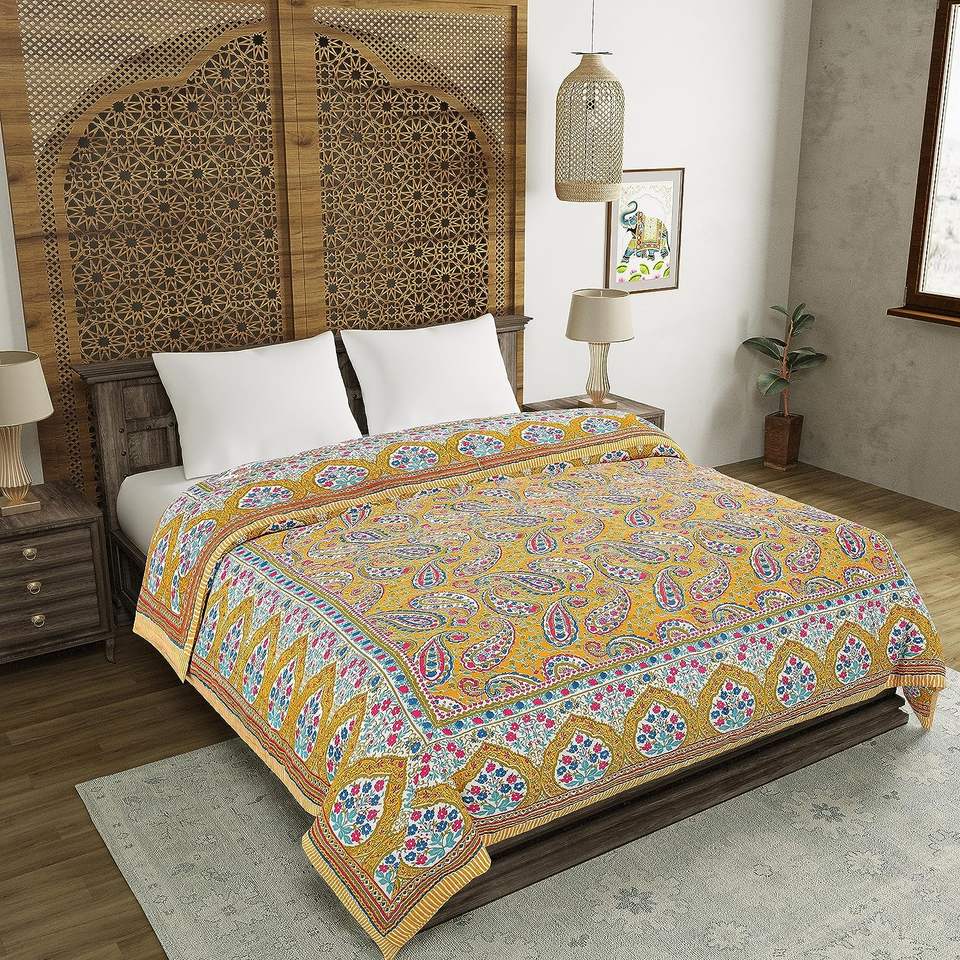 BLOCKS of INDIA Hand-Block Printed Yellow GAD Paisley Cotton King Size Quilt