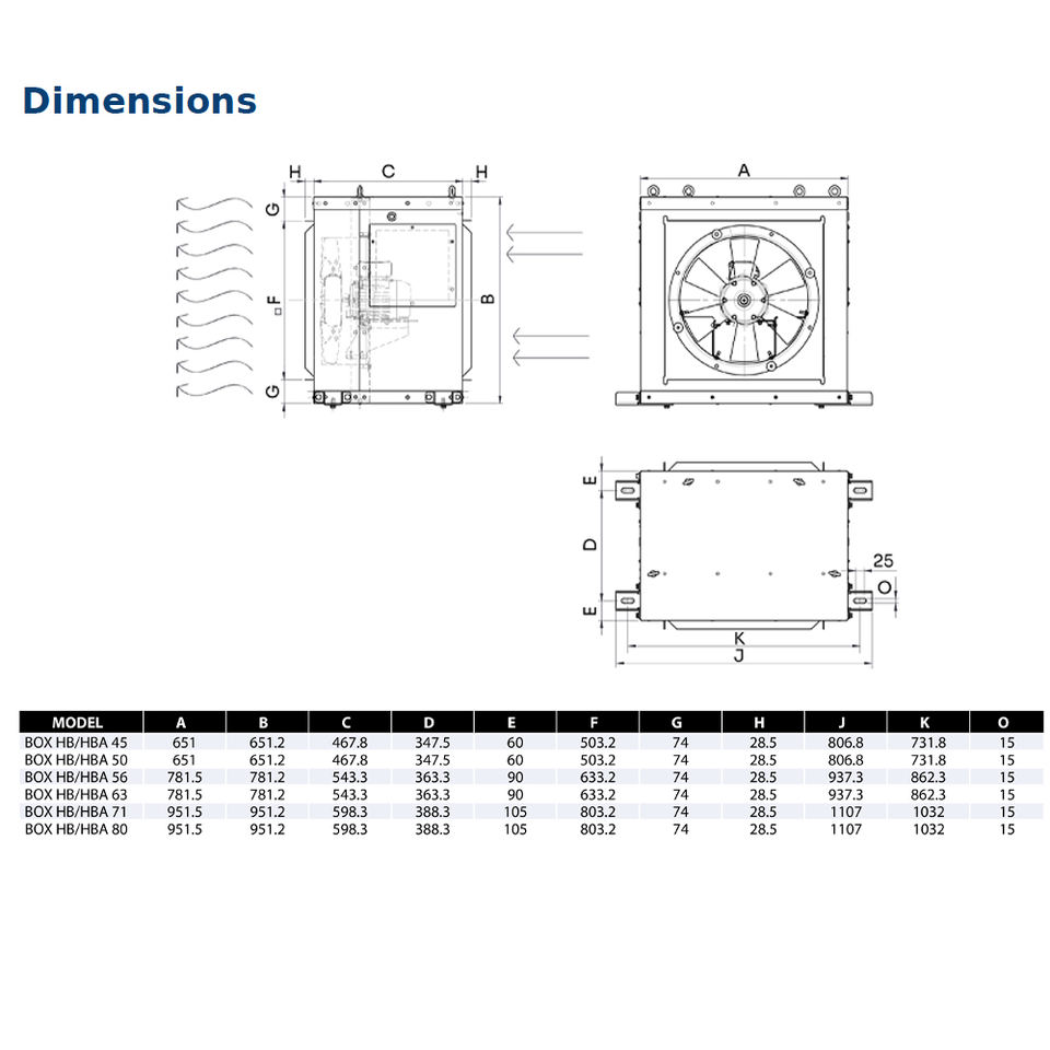 BOX HBA 50 T6 (A5:6) cabinet axial fan with variable-pitch polyamide impeller, IP55 motor, Class F insulation; airflow range