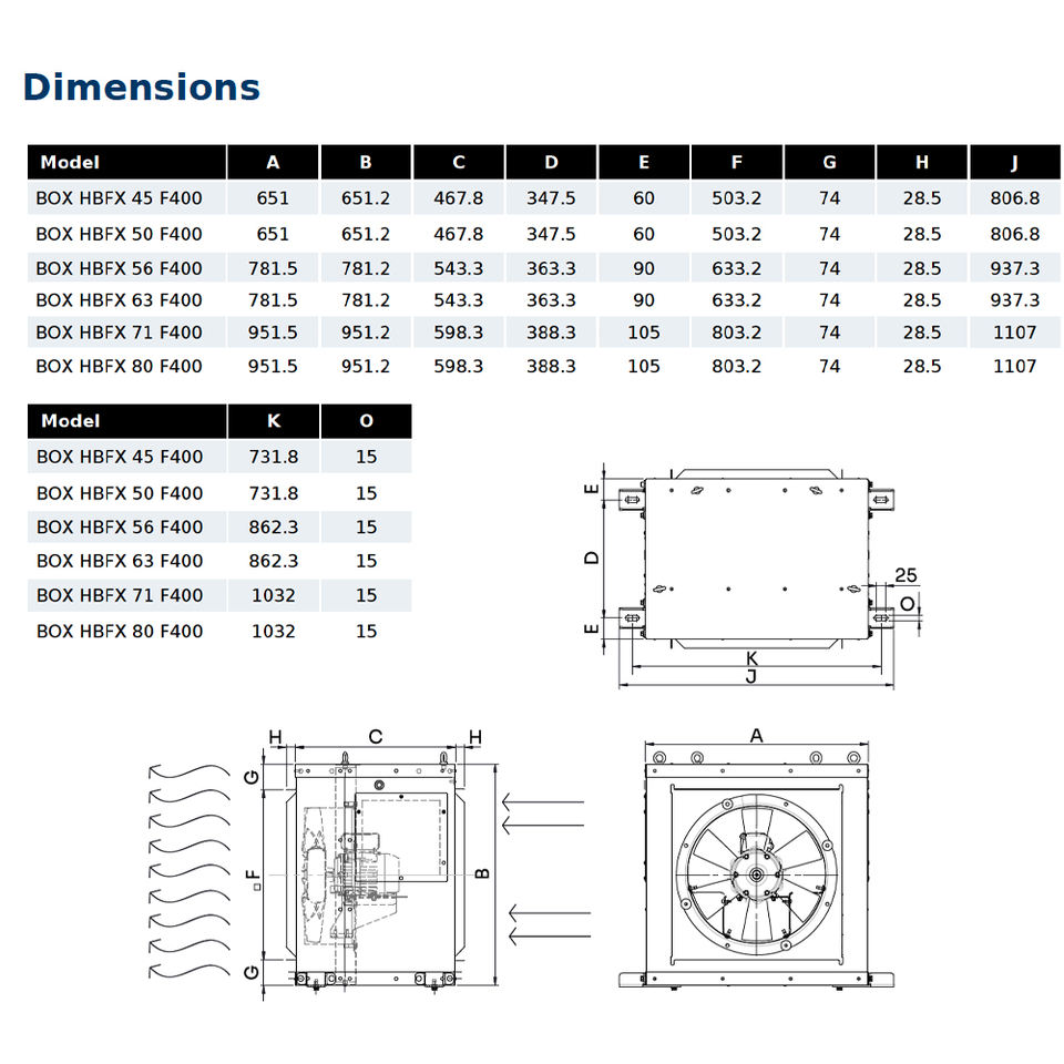 BOX HBFX 45 T6 F400 ATEX certified smoke extraction axial fan; range airflow from 6170 to 141010 m³/h