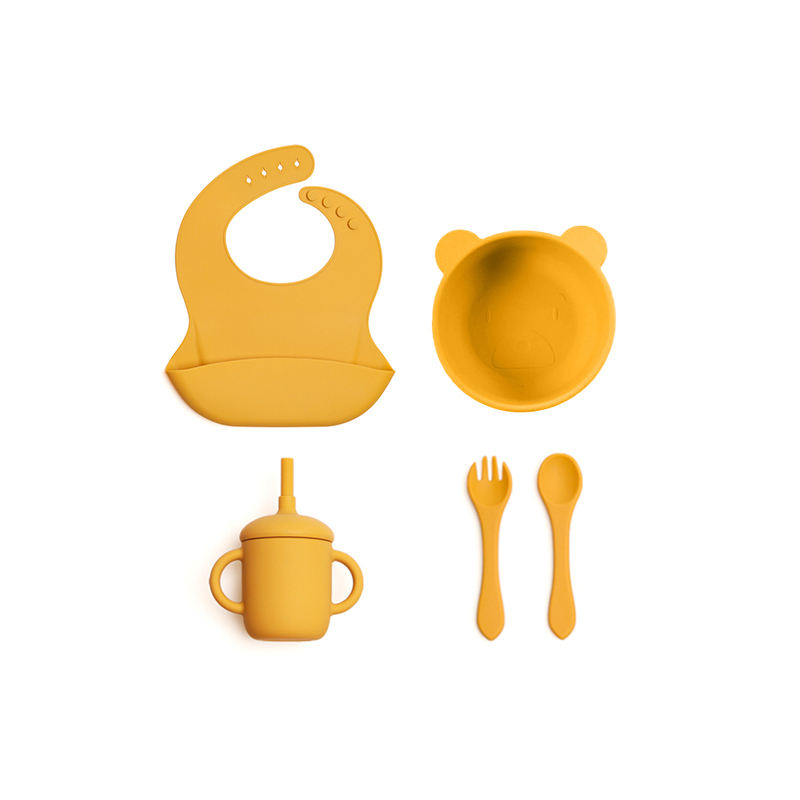 BPA Free Silicone Suction Plate Bowl Baby Bib Cup Spoon Fork Baby Dinnerware Feeding 5 Pcs Cutlery Tableware Weaning Set