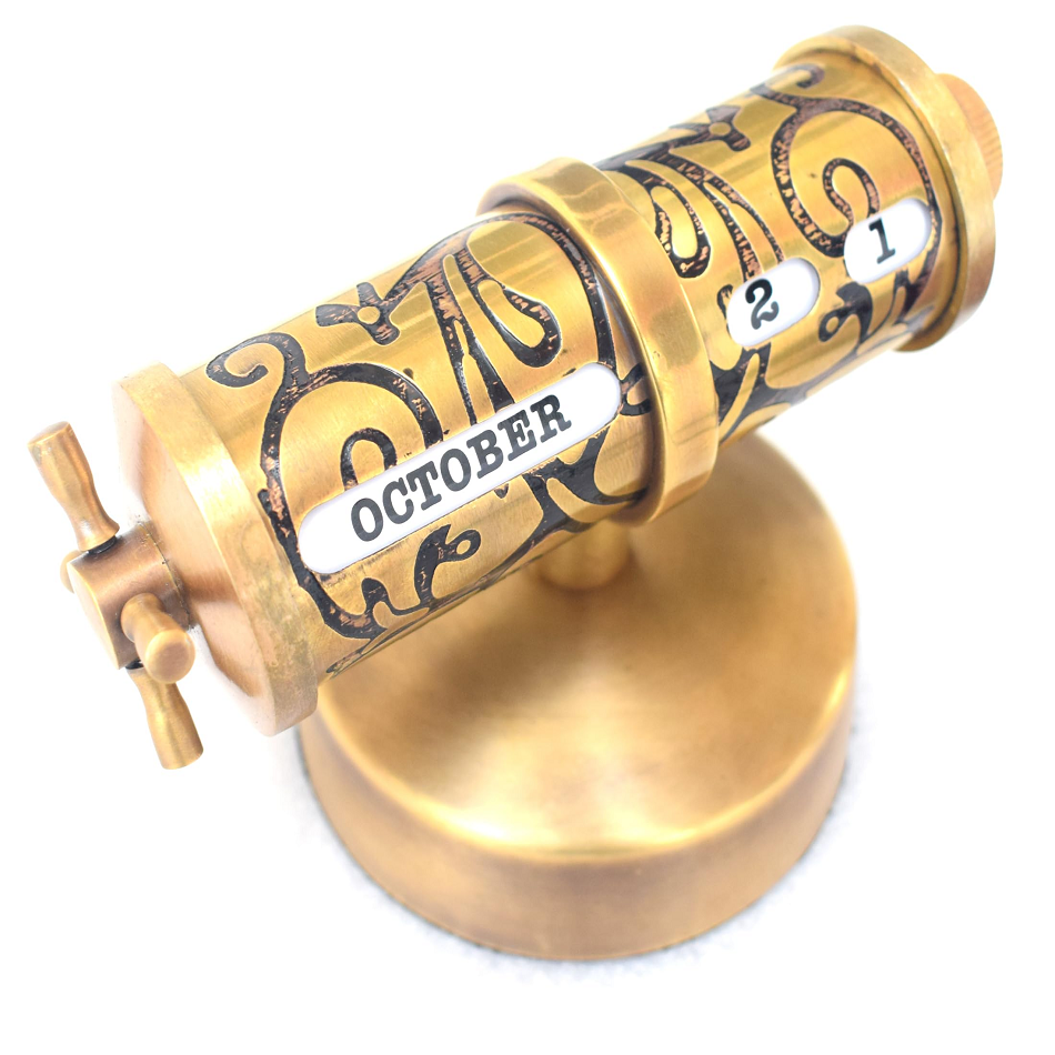 Antique Style Brass Aluminium Desktop Calendar with Desk Clock Handmade Premium Office Accessory