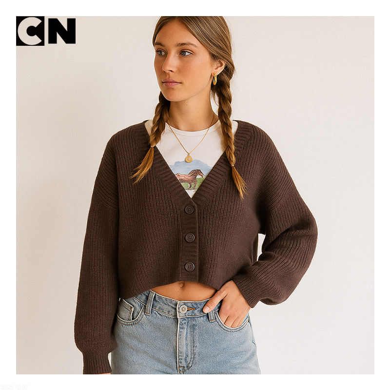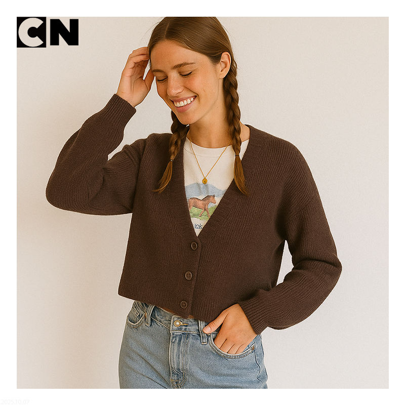 BSCI Certification Sweater Manufacturer Custom Logo Women Button V Neck Brown Chunky Knit Cropped Cardigan For Spring Autumn