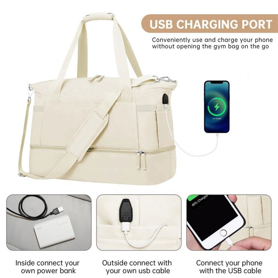 BSCI Custom Women's Gym Bag Casual Tote Weekender Duffel with USB Port Wet Pocket and Shoes Compartment for Travel