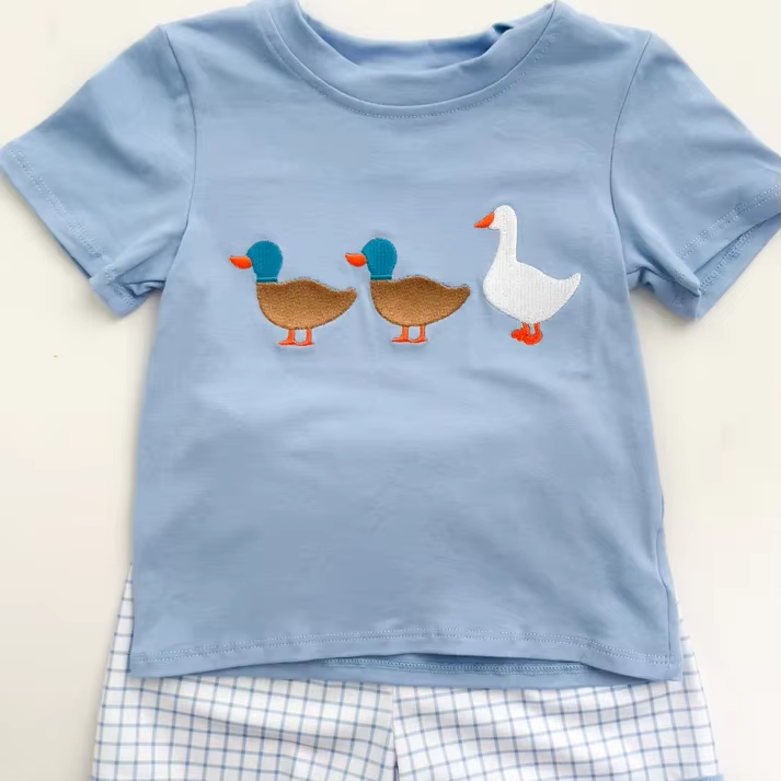 BSSO1567 Custom Little Boy Boutique Blue duck goose print outfits kids wholesale toddler boy short sleeve child set