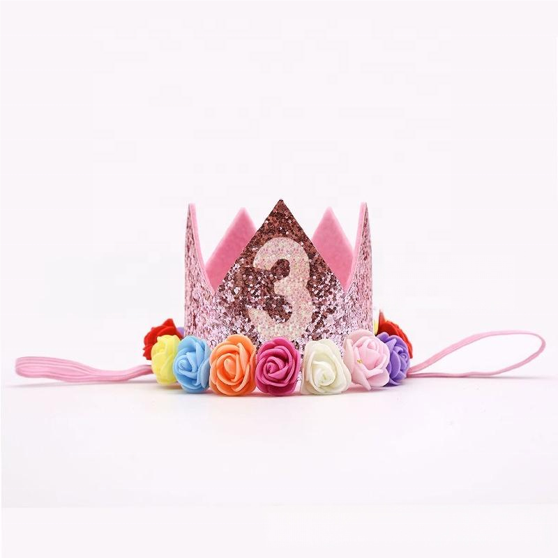 Cute Baby Birthday Crown Princess Tiara Girls Party Hat with Glitter Pink Roses for 1-9 Years Old Christmas Birthday Decorations