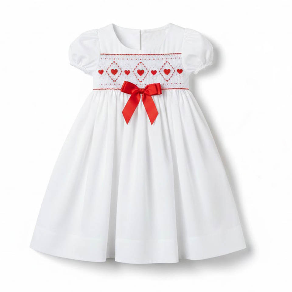 Baby Girls Hand Smocked Cute Valentine Hearts Dress with Ribbon Bow