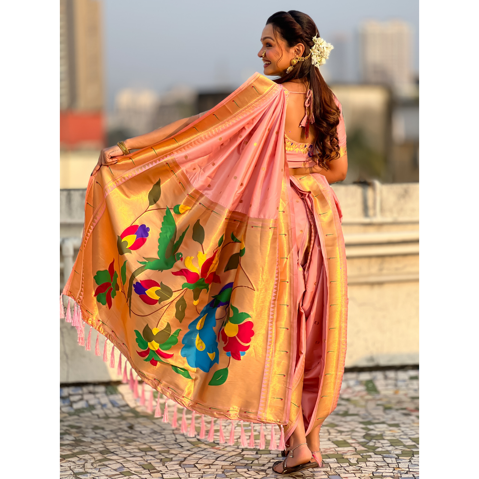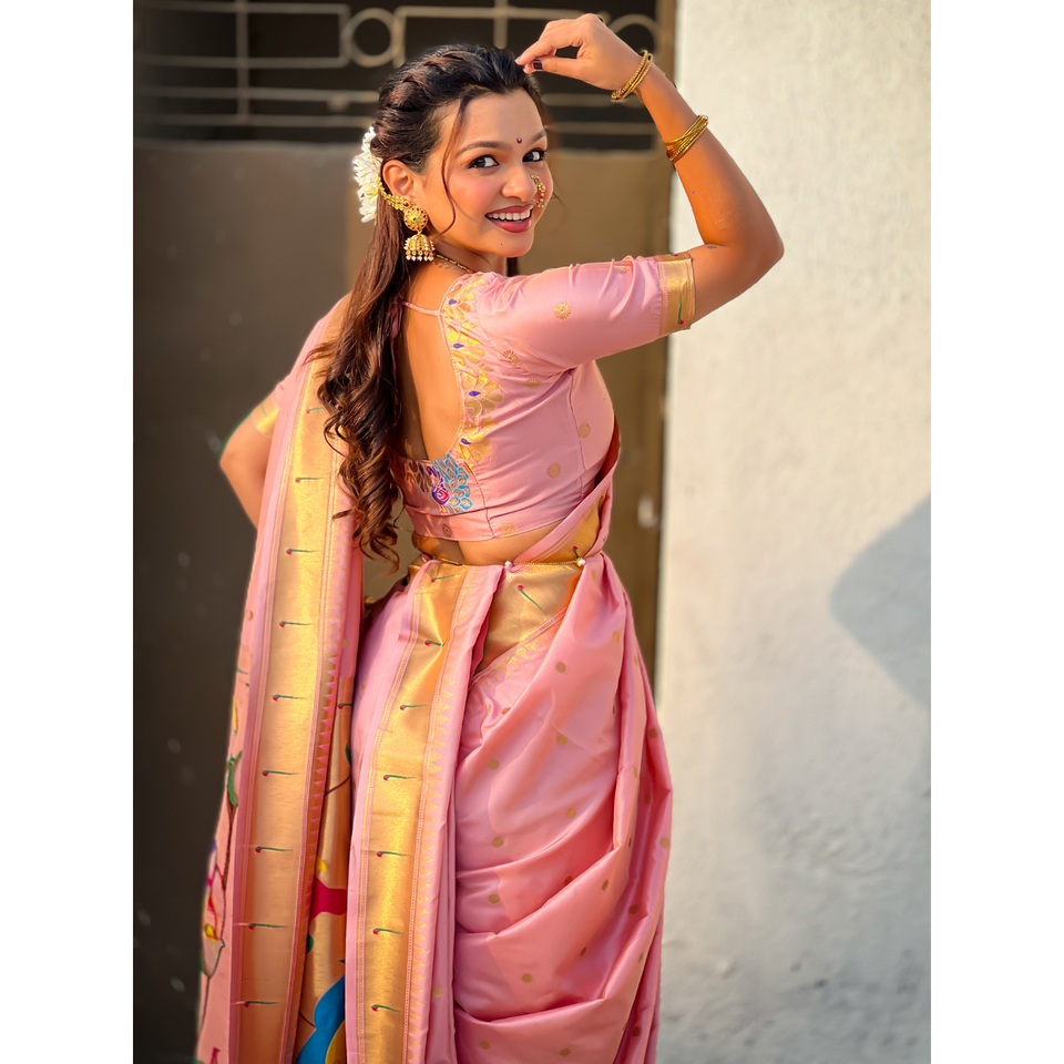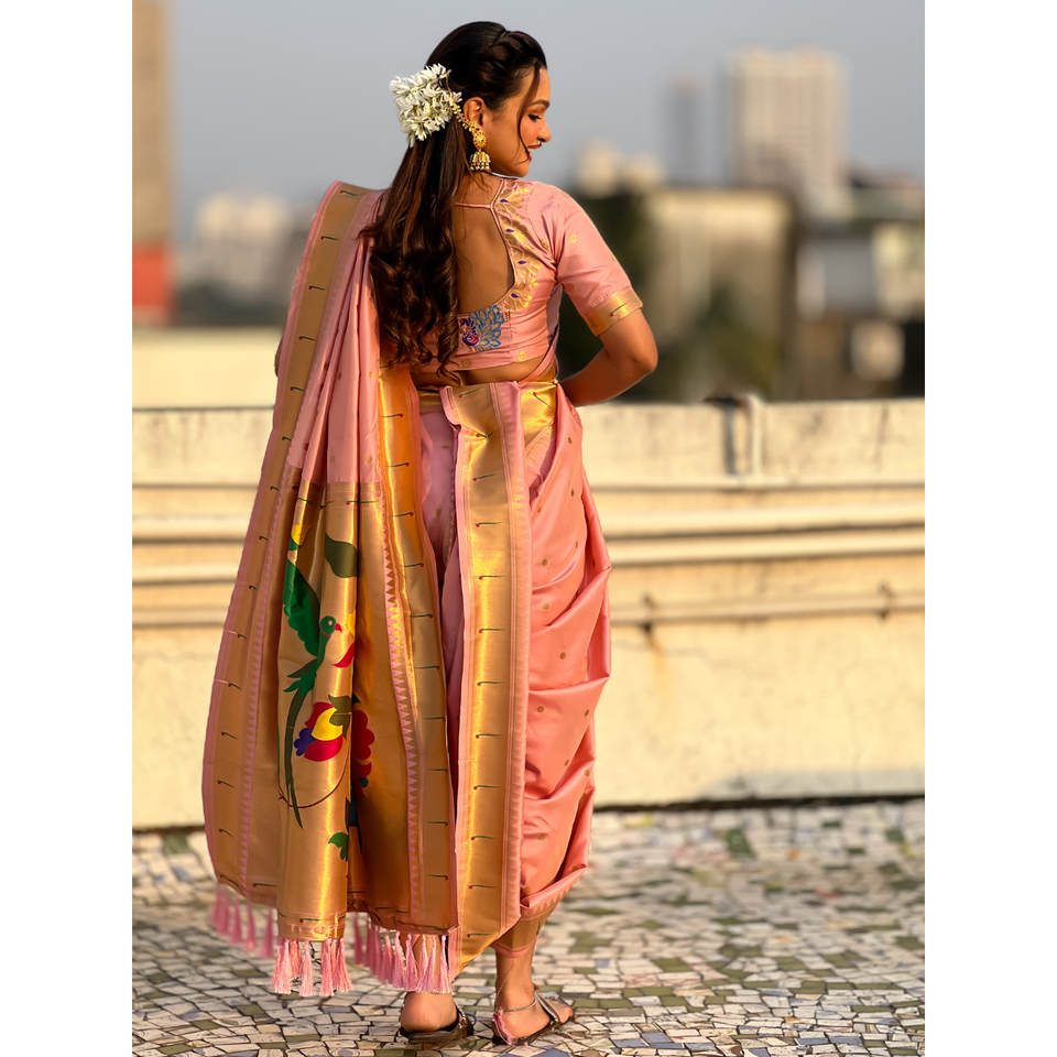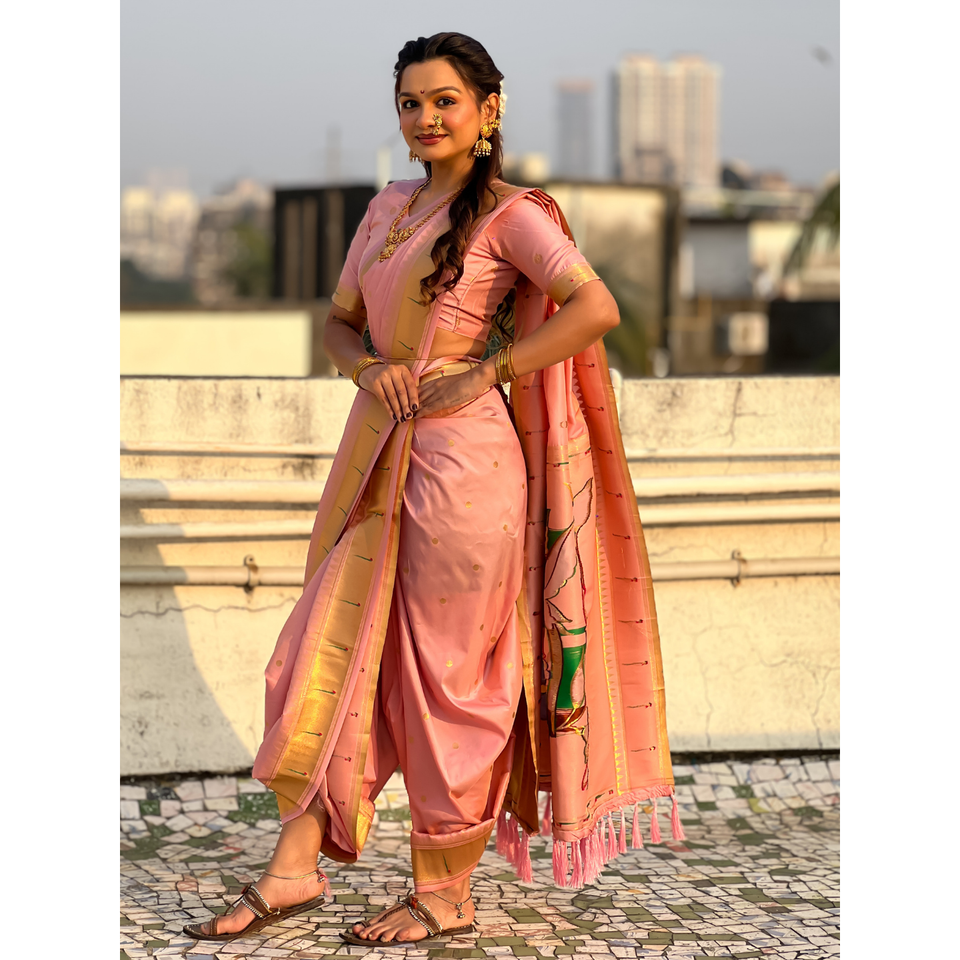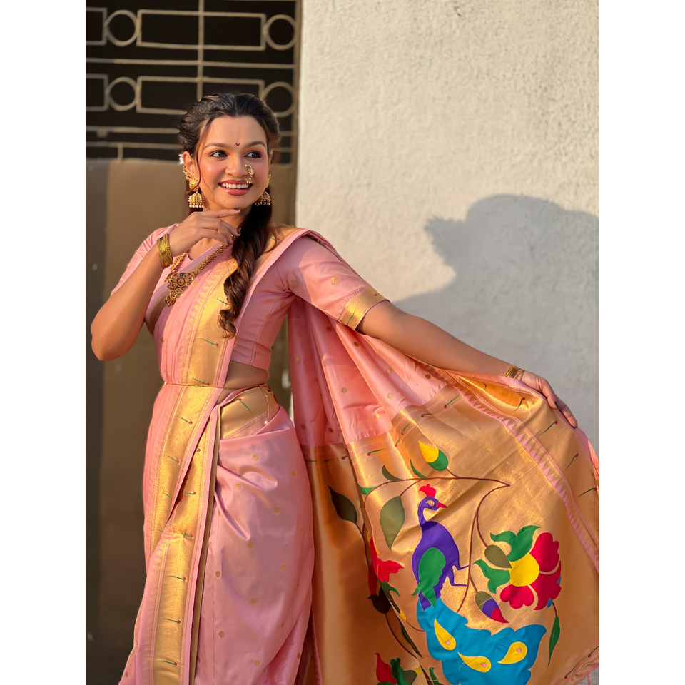Baby Pink Nauvari Paithani Saree Soft Silk Wedding Special Indian & Pakistani Clothing Zari Woven Polka Motifs Peacock Pallu