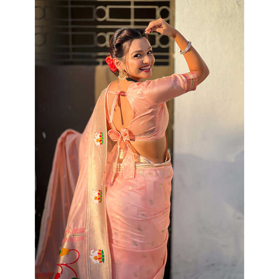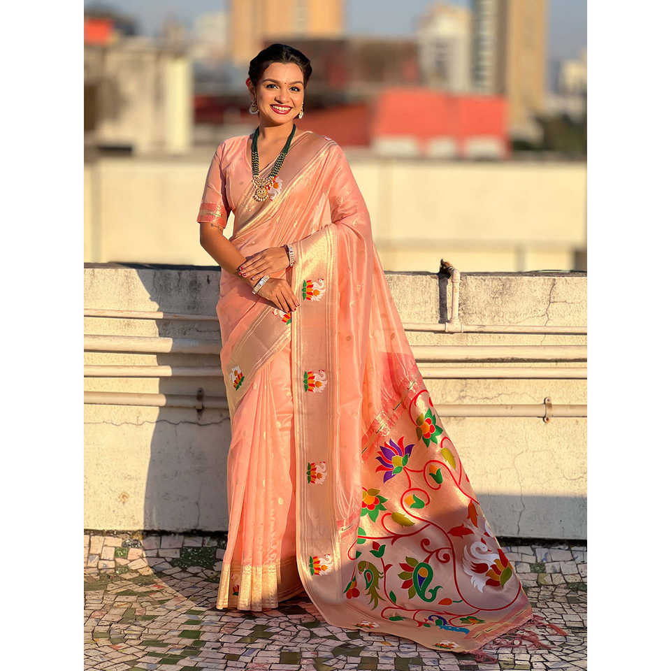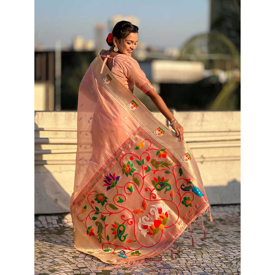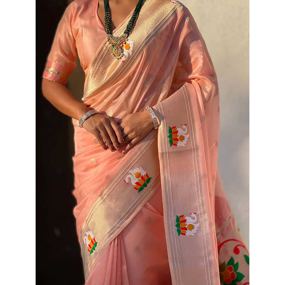 Elite Weaves Baby Pink Organza Swan Paithani Silk Zari Woven Luxury Saree Shall for Womans