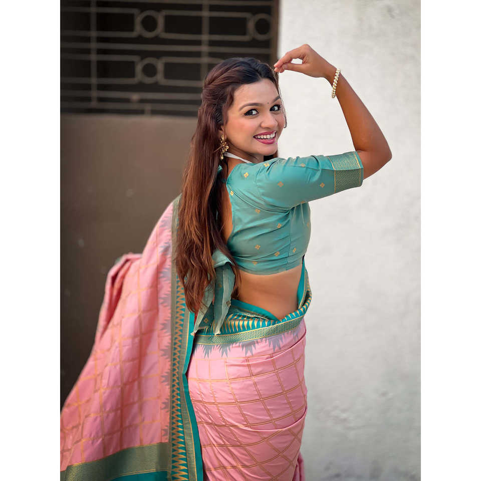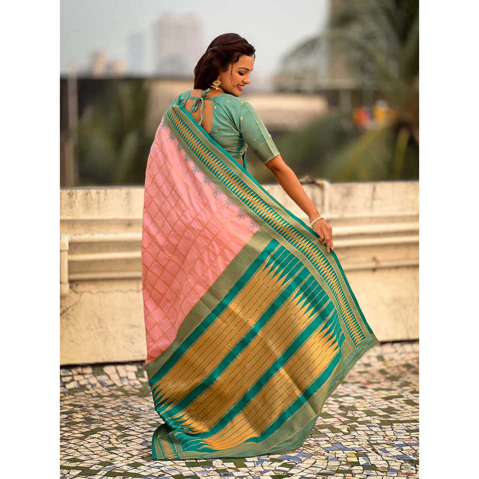 Baby Pink Women's Traditional Zari Contrast Woven Silk Saree Shawl with Checks Pattern Stretchable for Party Occasions