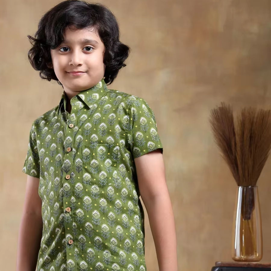 Bachpan Mehendi Green Boys Cotton Hand Block Shirt | Spread Collar Regular Fit | Breathable Soft Ethnic & Casual Wear